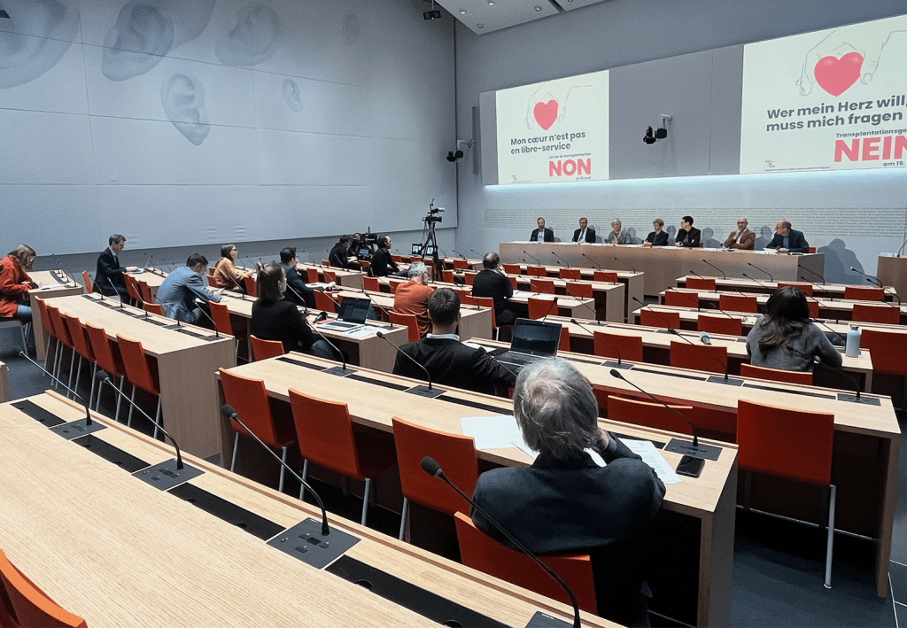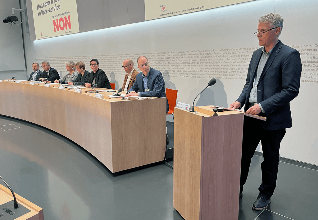 Das Nein-Komitee startet mit einer Medienkonferenz offiziell den Abstimmungskampf gegen das revidierte Transplantationsgesetz. Die Hebamme Susanne Clauss, der pensionierte Arzt Alex Frei, GLP-Alt-Regierungsrätin Verena Diener und weitere Politiker_innen präsentieren dort ihre Argumente gegen die Widerspruchslösung bei der Organspende. Das zusammengewürfelte Komitee bietet dem Bundesrat und der Parlamentsmehrheit die Stirn und sieht sich in der Rolle des Davids. Sind die Gegner wirklich in der Rolle eines Davids gegen die übermächtige Politik und Wirtschaft? Wie motiviert ist die 57-jährige Susanne Clauss, sich in einen Abstimmungskampf um Leber und Tod zu begeben?